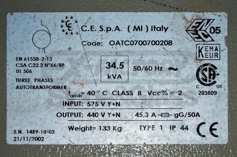 575 V Y+N to 440 V Y+N Step-Down Transformer.